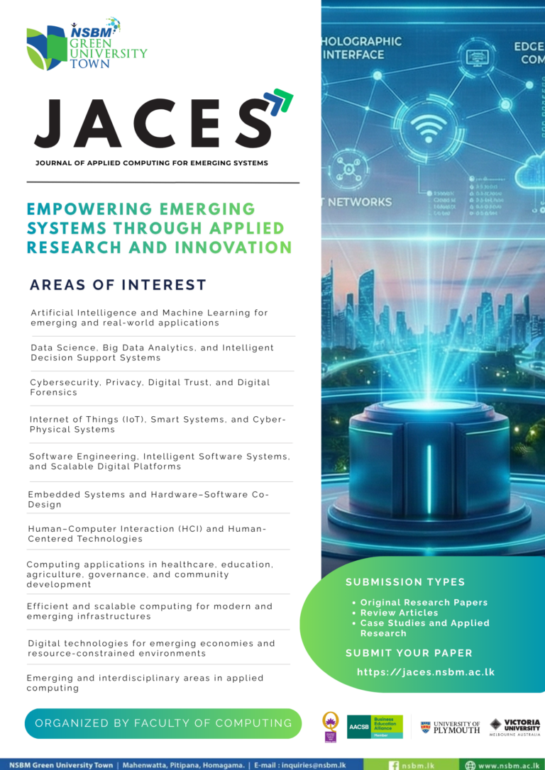 The Journal of Applied Computing for Emerging Systems (JACES) publishes original research articles, review papers, case studies, and applied research that advance innovative computing solutions for emerging systems and technologies. The journal is dedicated to the design, development, integration, and evaluation of applied computing approaches that address real-world challenges in rapidly evolving technological environments.
